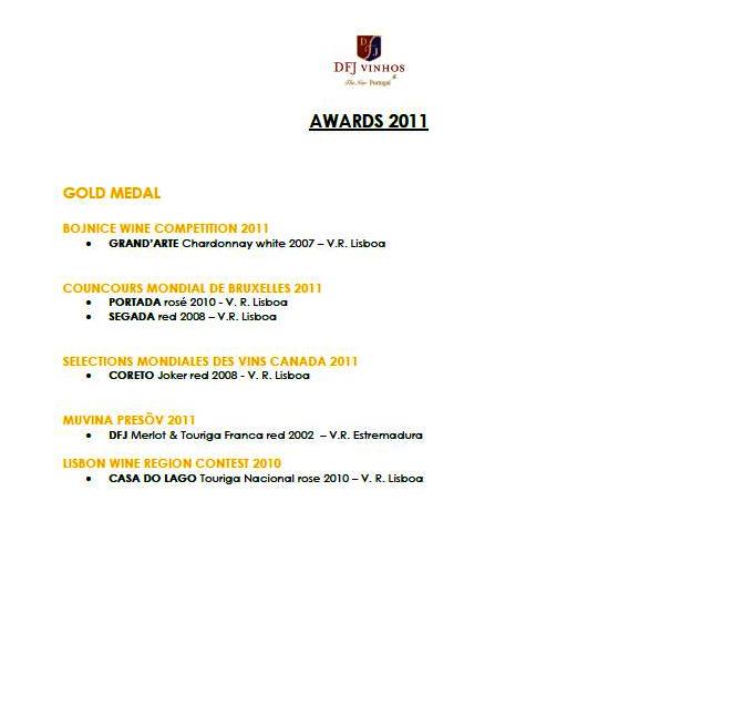 O único vinho Português a ser premiado no “Concurso Mundial de Sauvignon 2011” – Medalha de Prata.